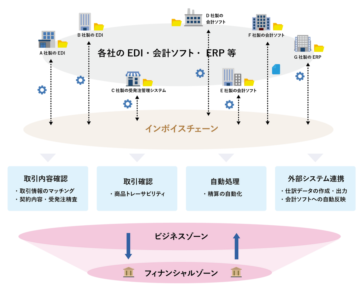 「非競争領域での共通化により、お客様の満足度を上げられる基盤が創れるのではないか」と既存の会計ソフトや業務システムを大きく作り替えることなく接続できるシステムを構築し、企業間で共有できる社会基盤の構築が作れないかと始まりました。