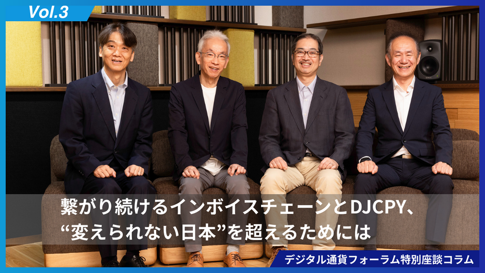 こうした現状を踏まえ、今回の座談会では、インボイスチェーン分科会の幹事である日野様(株式会社オービックビジネスコンサルタント)・福田様(株式会社 日立製作所)・岩田様(株式会社ミロク情報サービス)に、インボイスやブロックチェーンなど次世代技術の導入状況も交えながら、企業間精算DXの現状と課題、分科会が取り組みとともに、デジタル通貨DCJPYがどのように貢献できるのかを山岡座長と語っていただきました。