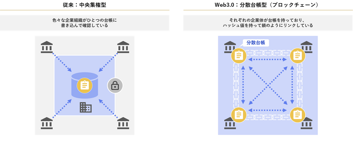 中央集権型と分散台帳型(ブロックチェーン)の比較