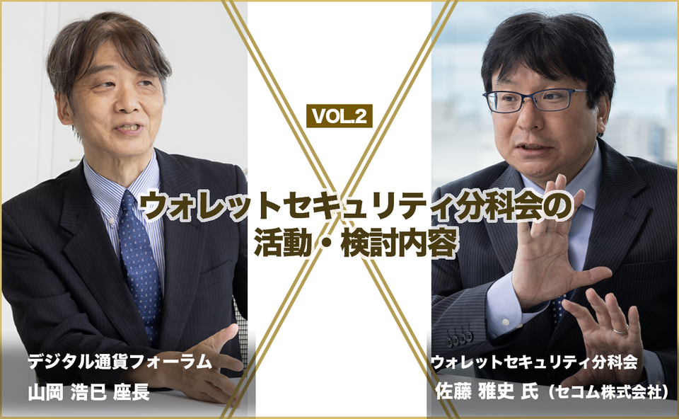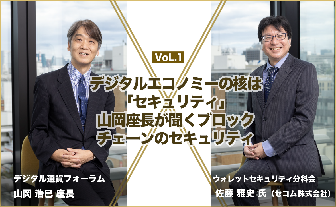 今回は、ウォレットセキュリティ分科会の幹事を務めるセコム株式会社の佐藤氏をお迎えし、デジタル通貨にとどまらず、広く分散型技術・ブロックチェーンを応用したデジタル経済活動全般に対して重要なポイントとなるセキュリティについて、山岡座長とお話しいただきました