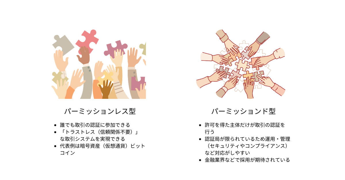 ブロックチェーンや分散台帳技術には、誰でも取引の認証に参加できる、すなわち「認証局」になれる「パーミッションレス型」と、許可を得た主体だけが取引の認証を行う「パーミッションド型」があります。