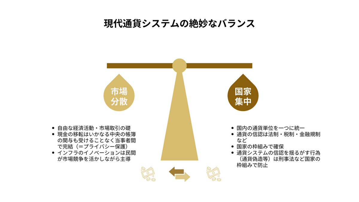 見方を変えれば、現在の通貨システムは、国と市場、あるいは集中と分散の絶妙なバランスの上に成り立っています。