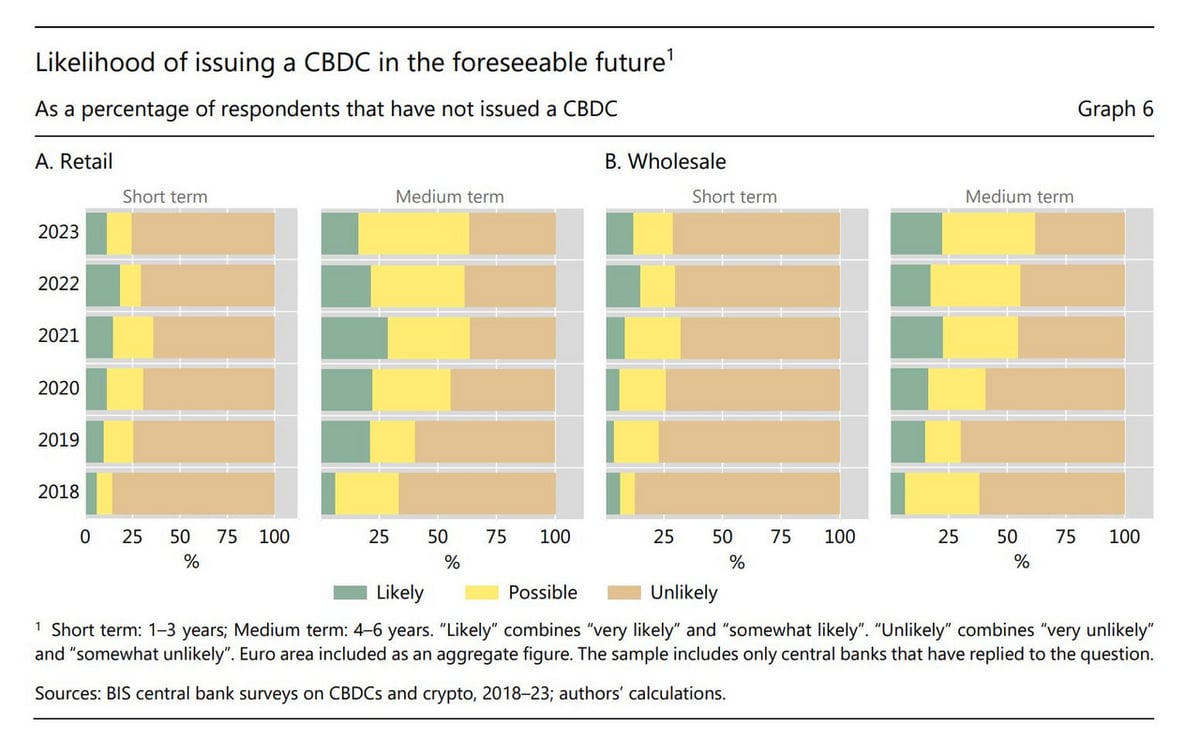 山岡:そう思います。もともとリテールCBDCに関しては、米国の共和党が反リテールCBDCの姿勢を明確に打ち出す前から、「とりわけ先進国では、リテールCBDCが近い将来に発行されるという訳ではなさそうだ」という慎重な見方が、BISのアンケート調査などからも明らかになってきていました(下図)*9。この中で、国際的な関心も、リテールCBDCから、かつては「ホールセールCBDC」と呼ばれていた、「ブロックチェーン・分散台帳を応用したRTGSシステム」とトークン化預金などの民間デジタル通貨の連携に移ってきていたように感じます。このような取り組みを、BISなどは「CBDC」という言葉を使わず、「統合台帳」(“Unified Ledger”)や“Finternet”などの新しい言葉で表現するようになっているわけです*10。