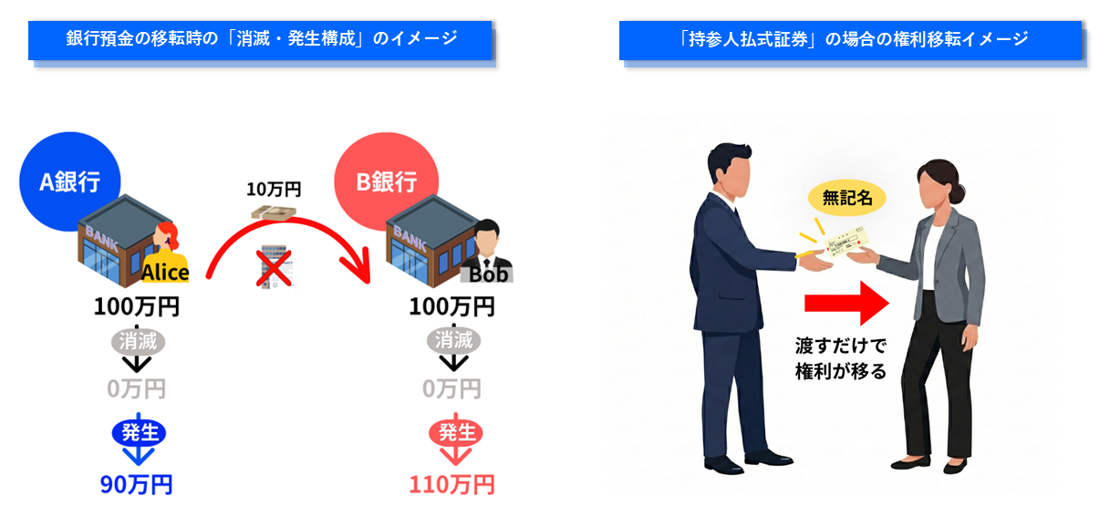 例えば、A銀行に100万円の残高を持つAliceが、B銀行に100万円の残高を持つBobに10万円の送金をする場合、A銀行に対するAliceの10万円の債権がBobに譲渡されると捉えるのではなく、A銀行、B銀行の100万円の預金残高がいったん「消滅」し、直ちに90万円、110万円の残高が新たに「発生」することになります。これにより、送金のたびに確定日付証書を発行する必要はなくなるわけです。