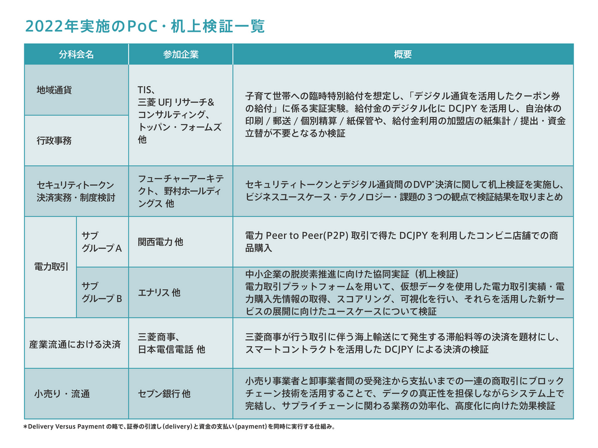 今回のプログレスレポート第2号は、前回レポートで公表した各分科会によるユースケースに対し、40社以上(延べ参加メンバー数)が参加した概念実証(以下、PoC)・机上検証や銀行によるデジタル通貨DCJPY(仮称:以下、DCJPY)の試験発行の実施等各分科会の実践的な2022年の活動報告を中心としたレポートとなります。