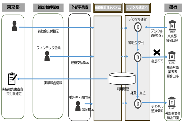 - 東京都から事業者へ補助金(交付決定額)をデジタル通貨で交付します。事業者は交付されたデジタル通貨を自らの銀行口座で償却・現金化することはできません。