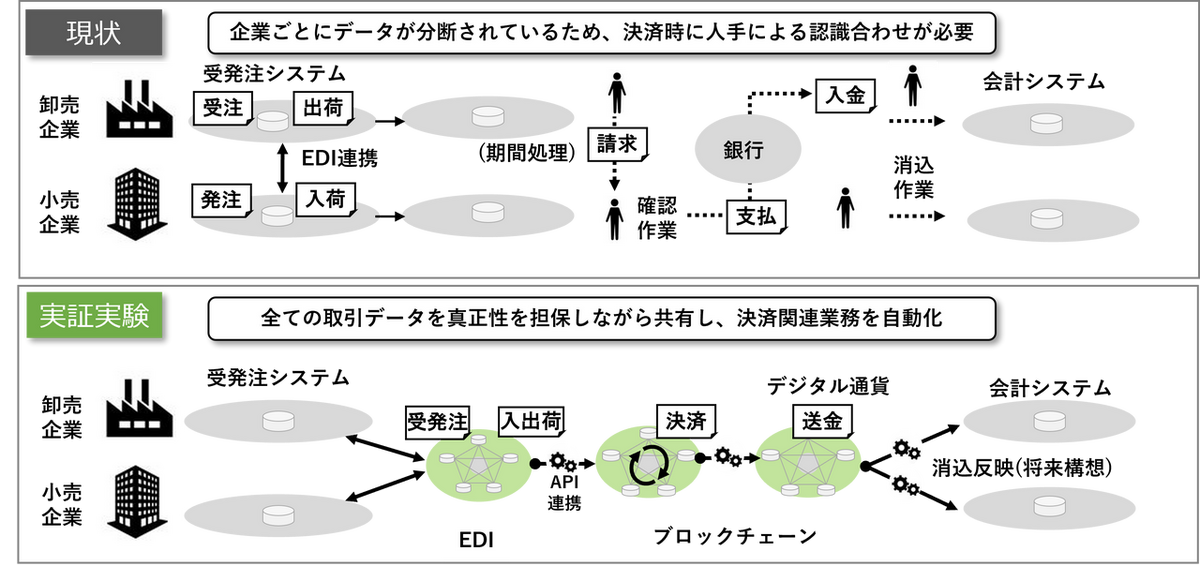 今回の実証実験では、小売・卸売の企業間における流通BMS*3(EDIサービス)を用いた商取引において受発注から支払いまで一連の流れをデジタルで完結することにより、主に商品受領後の資金決済業務における効率化の検証を行います。具体的には、担当者の負担となっている書類の照合・確認などの作業に対し、EDIとブロックチェーンを連携した環境上で、全ての取引データの真正性を担保した上で共有し、デジタル通貨を使って決済・送金を自動化することで、一連の流れをデジタルで完結させます。