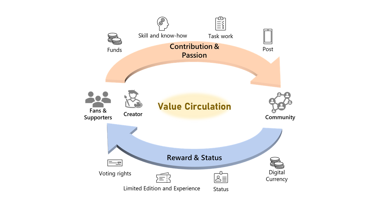 We will create a sustainable community where creators—who face challenges such as fundraising, isolated production environments, and complex rights distribution—can share resources and insights with fans and other creators through community engagement. This will enable them to devote themselves to free creative expression through co-creation and transparent revenue sharing. - Visualizing contribution levels to turn “Fandom Activities” into value and providing new reward experiences for fan
