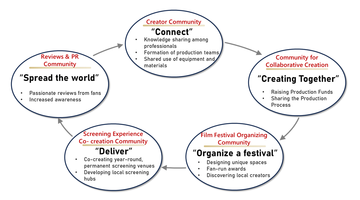 By building diverse communities—such as teams for voluntary content creation, crowdfunding for production funds, fan participation in the production process and film festival operations, and co-creation with fans and supporters regarding screening venues, work evaluations, and promotions—and fostering mutual collaboration among them, we aim to accelerate the entire process from a work’s creation and release to its widespread dissemination.