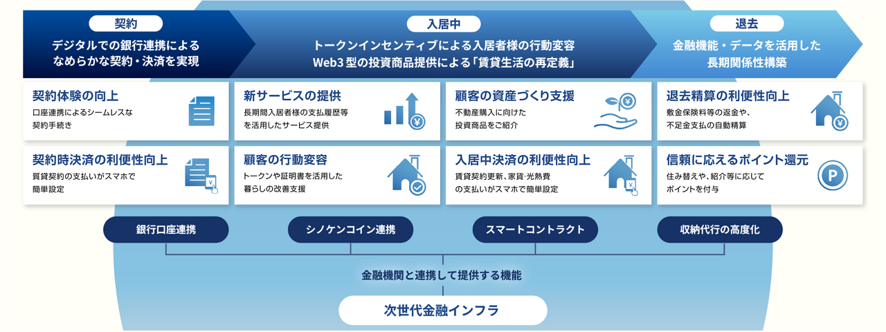 今回の実証実験(PoC)では、シノケングループの賃貸管理における月次賃料の支払いをユースケースとして、トークン化預金を活用した決済の自動化・効率化を検証し、2025年12月末の完了を目指します。結果を踏まえ、2026年以降の本格的な導入に向けて準備を進めてまいります。
