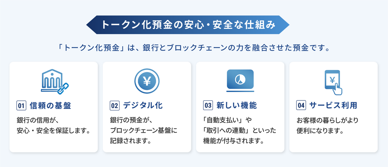 トークン化預金は、銀行預金をトークン化したもので、銀行預金と同じ安心・安全を備えながら、ブロックチェーンなどの技術を活用し、デジタル上で便利に使える預金です。取引記録や契約条件などのデータを連動させ、資金の流れのコントロールや自動化など、多様なサービスに活用できます。
